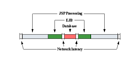 In client-side coding, you can minimize perceived response time by displaying partial results or status bars. However, in server-side coding, all you can do is minimize the in-server response time to an acceptable level. It helps to break down the response time into time spent in each component and subsystem. Figure 1-1 illustrates the processing of a Web form request to a JSP that calls an EJB component which in turn executes a remote database query. A slowdown can occur in any of these components. When tuning, you must isolate the part of your deployment that is causing the delay.