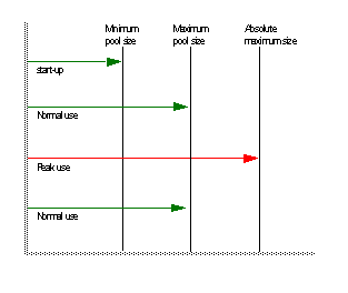 Set the pool size so the majority of database connections are taken from the cache. You can tune the minimum pool size and refresh rate parameters to reduce the number of database connections that are held during off-peak hours. You can raise the maximum size if you see many failed connection requests or waits.