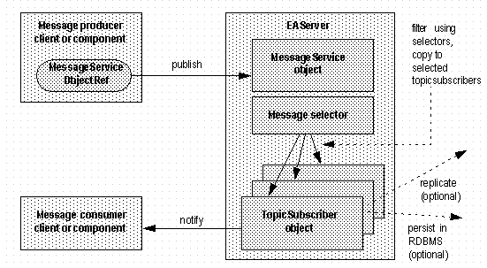 A TopicSubscriber object receives published messages and can be either durable or nondurable. A nondurable subscriber can only receive published messages while it is connected to EAServer. If you want guaranteed message delivery, make the subscriber durable. For example, if you create a durable subscription on a topic, EAServer saves all published messages for the topic in a database. If a durable subscriber is temporarily disconnected from EAServer, its messages will be delivered when the subscriber is reconnected. The messages are deleted from the database only after they are delivered to the durable subscriber.