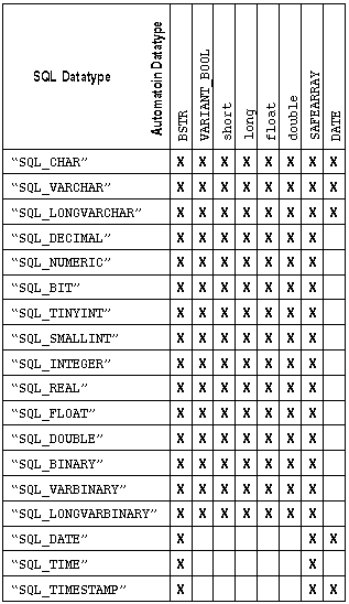 The SQLDatatype value passed to DescribeCol determines the datatype with which column values are sent over the network. If the program variable type does not map directly to the column’s SQL datatype, SendData attempts to convert the value. The figure below shows the supported conversions between SQL datatypes and bind variable types. An X indicates a supported conversion.