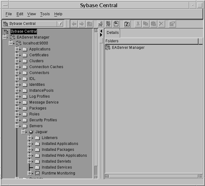 EAServer Manager runs within Sybase Central. Use EAServer Manager to configure EAServer and to define and deploy software components and packages. EAServer Manager is EAServer’s graphical user interface tool that allows you to easily define the packages, components, and methods that EAServer clients use to run an application.