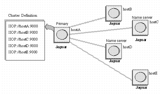 Figure 6-1 illustrates a server cluster and uses hostA as the primary server to synchronize the participating servers, including the name servers. Each server in the cluster is named “Jaguar.”